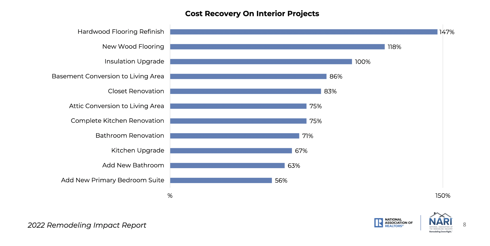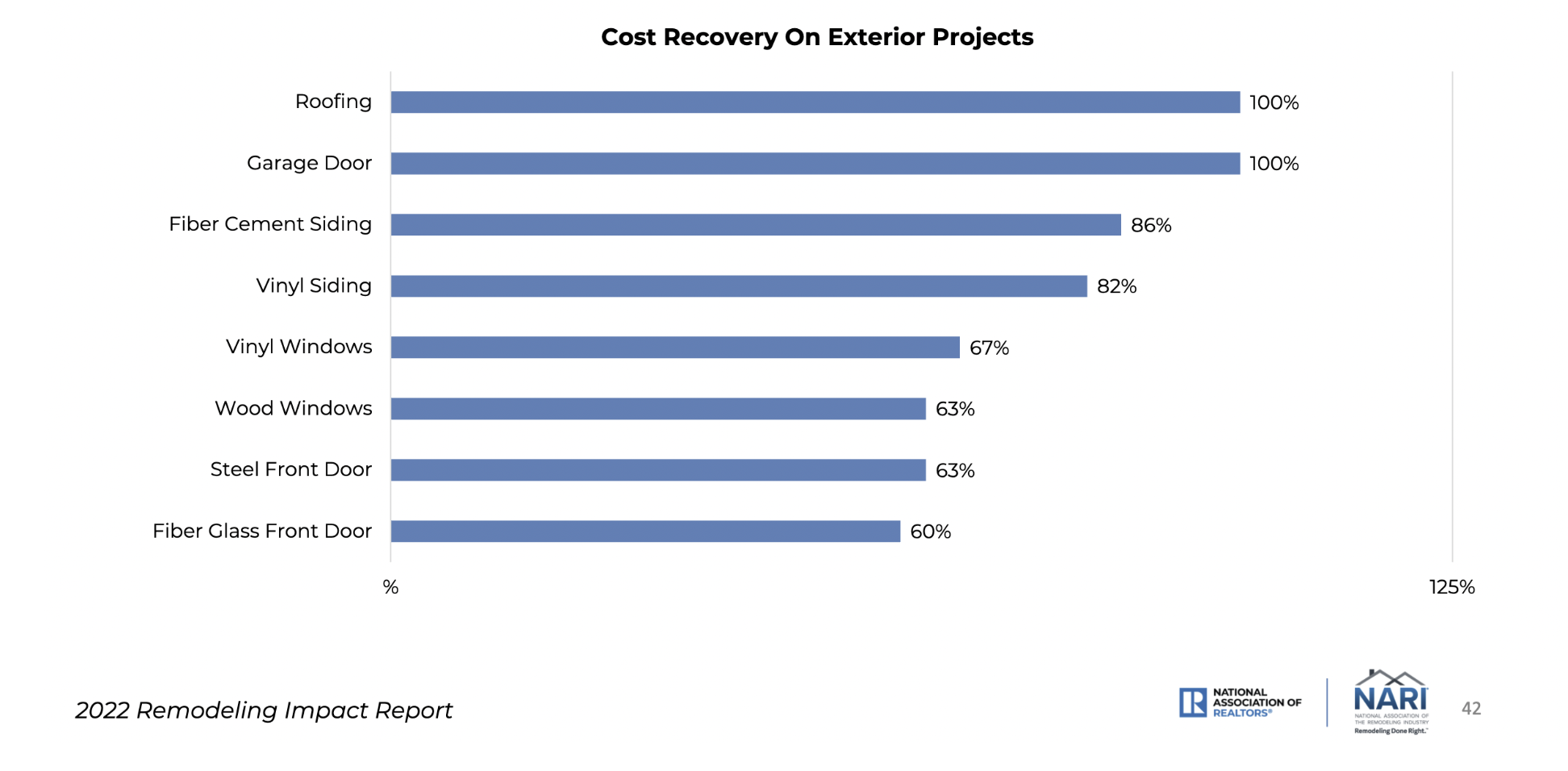 Below are two charts from the 2022 Remodeling Impact Report published by the National Association of Realtors (NAR) and the National Association of the Remodeling Industry (NARI). For interior projects, hardwood flooring refinish and new wood flooring installs take the top spots returning 118 - 147% of the cost of the project. When it comes to exterior remodeling, roofing (no surprise in Colorado especially) and garage doors both show a 100% return on cost.
